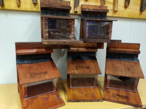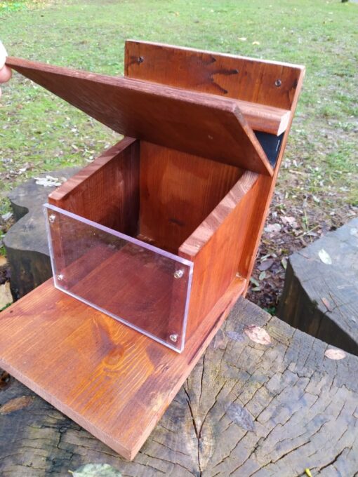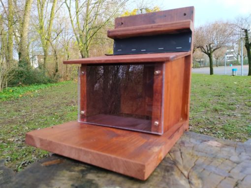 Futterstelle für Eichhörnchen, wenn sie schlau genug sind! Im Boden ist ein Sieb, dass sich keine Feuchtigkeit beim Futter ansammelt.